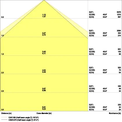 De gradenbundel geeft informatie over hoe breed het licht wordt uitgestraald. Dit zit tussen de 0 en 360 graden (D). Hoe kleiner de hoek, hoe specifieker de lichtbundel is. Over het algemeen is een smalle gradenbundel perfect voor sfeer- of accentverlichting, terwijl een brede gradenbundel ideaal is om grote oppervlaktes te verlichten.