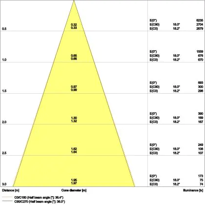 De lichtopbrengst en de gradenbundel spelen een grote rol. Zo geeft de lichtopbrengst van 720 Lumen in combinatie met de 36° stralingshoek deze inbouwspot een specifieke toepassing. Kort samengevat is een lichtintensiteit van maximaal 400 Lumen ideaal voor accentverlichting, terwijl hogere waardes goed gebruikt kunnen worden als basisverlichting. Over het algemeen geldt: hoe breder de gradenbundel, hoe geschikter deze is door basisverlichting. Dit komt doordat het licht over een groter oppervlak wordt verspreid. Smallere gradenbundels (tot 40°) kunnen echter bij hoge plafonds ook goed tot hun recht komen als algemene verlichting.