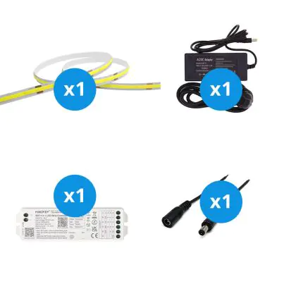 Het grote voordeel van deze complete set is dat je alle accessoires hebt die je nodig hebt om de beste lichtaccenten voor je huis of bedrijfspand te creëren. Je hoeft niet op zoek te gaan naar de juiste apparatuur; je hoeft alleen maar alle elementen met elkaar te verbinden. Daarna steek je de stekker in het stopcontact in je huis. Je kunt hier alles over lezen in onze installatieblog. Deze set bevat een: