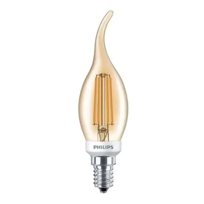 Beschrijving Philips Classic LED Kaars E14 gebogen punt Filament Goud 5W 410lm - 825 Zeer Warm Wit | Dimbaar - Vervangt 40W