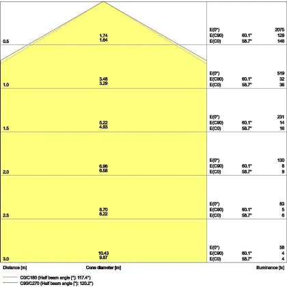 De lichtopbrengst (Lumen), geeft weer hoe krachtig het uitgestraalde licht is. Dit is belangrijk om te weten om de juiste sfeer te creëren. 0 tot 400 Lumen is bij uitstek geschikt voor accent- of sfeerverlichting. Een hoger aantal Lumen is, afhankelijk van de grootte van de ruimte, beter geschikt als ondersteunende- of basisverlichting. Heb je plafonds hoger dan 4 meter, dan is een lichtopbrengst van minimaal 8000lm aan te raden indien heldere verliching gewenst is (vb. in werkomgevingen).